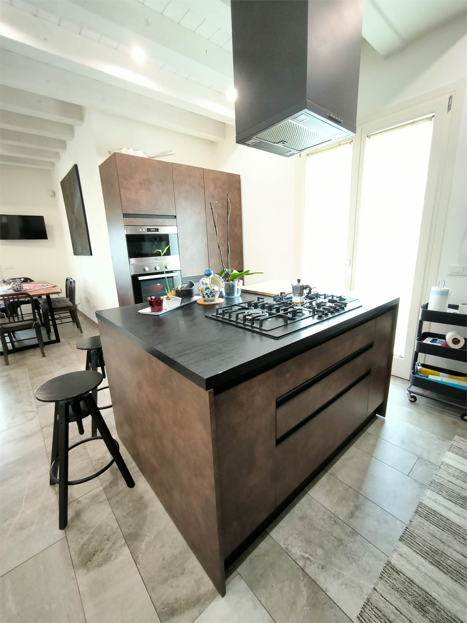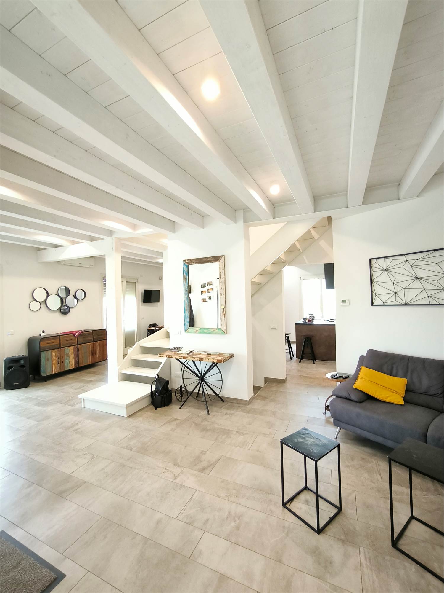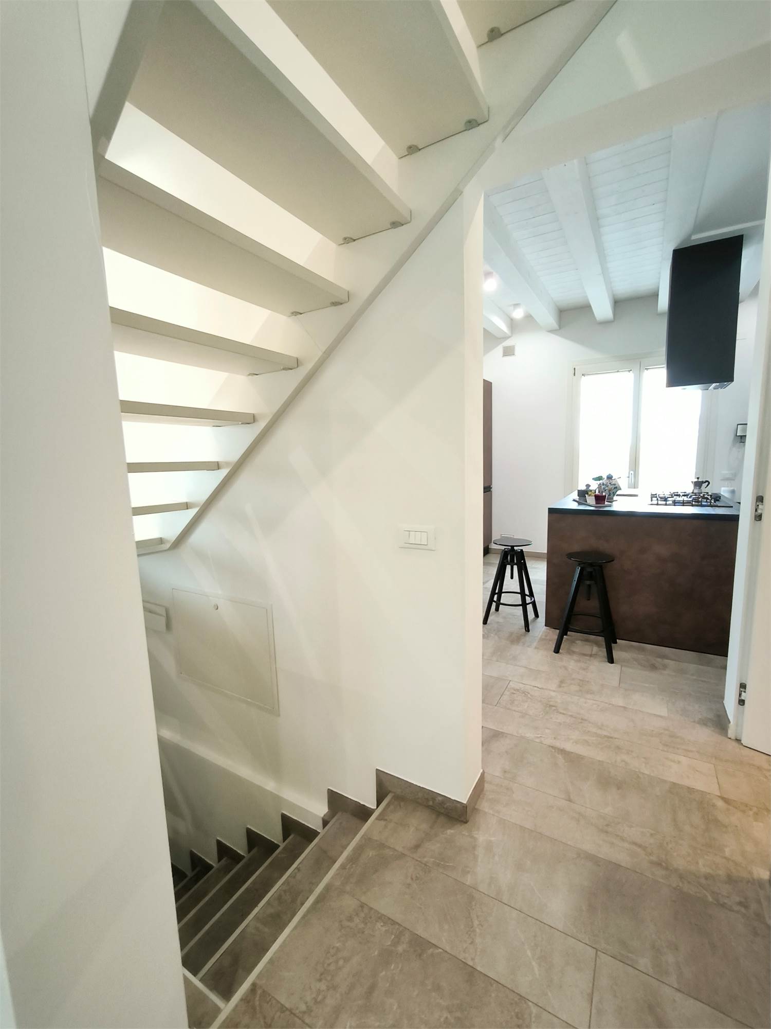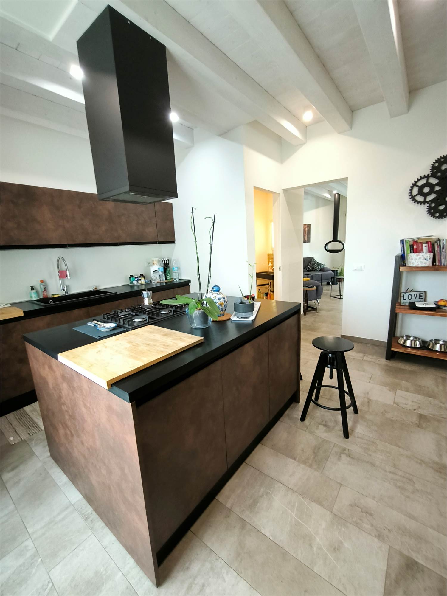 AL PIANO TERRA TROVIAMO UN GRANDE LIVING CON CAMINO, UNA CUCINA A VISTA CON CAPPA CENTRALE SOSPESA, UN BAGNO DI SERVIZIO ED UNA SCALA CENTRALE DI DESIGN CHE PORTA AI PIANI.