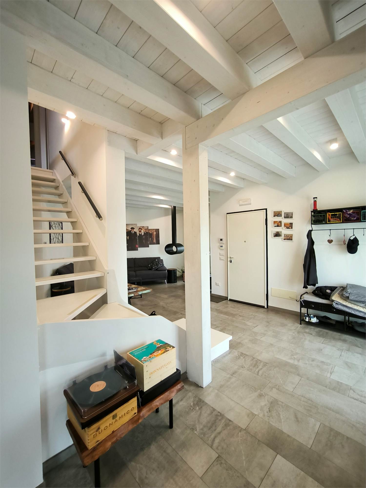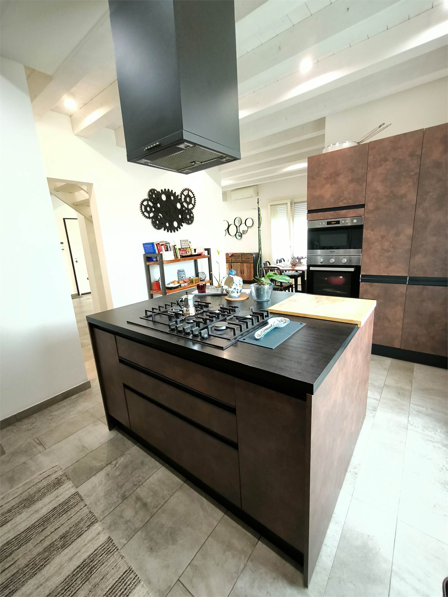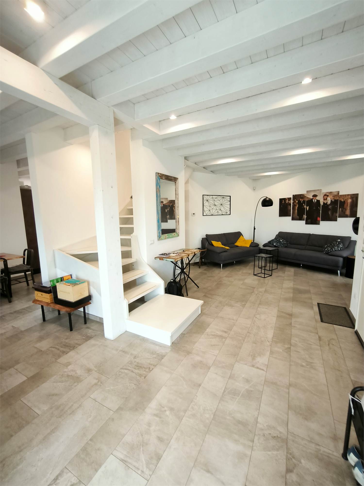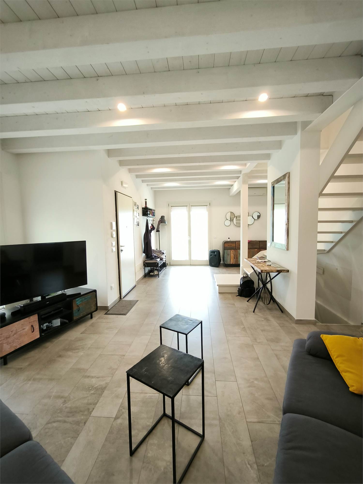 AL PIANO TERRA TROVIAMO UN GRANDE LIVING CON CAMINO, UNA CUCINA A VISTA CON CAPPA CENTRALE SOSPESA, UN BAGNO DI SERVIZIO ED UNA SCALA CENTRALE DI DESIGN CHE PORTA AI PIANI.