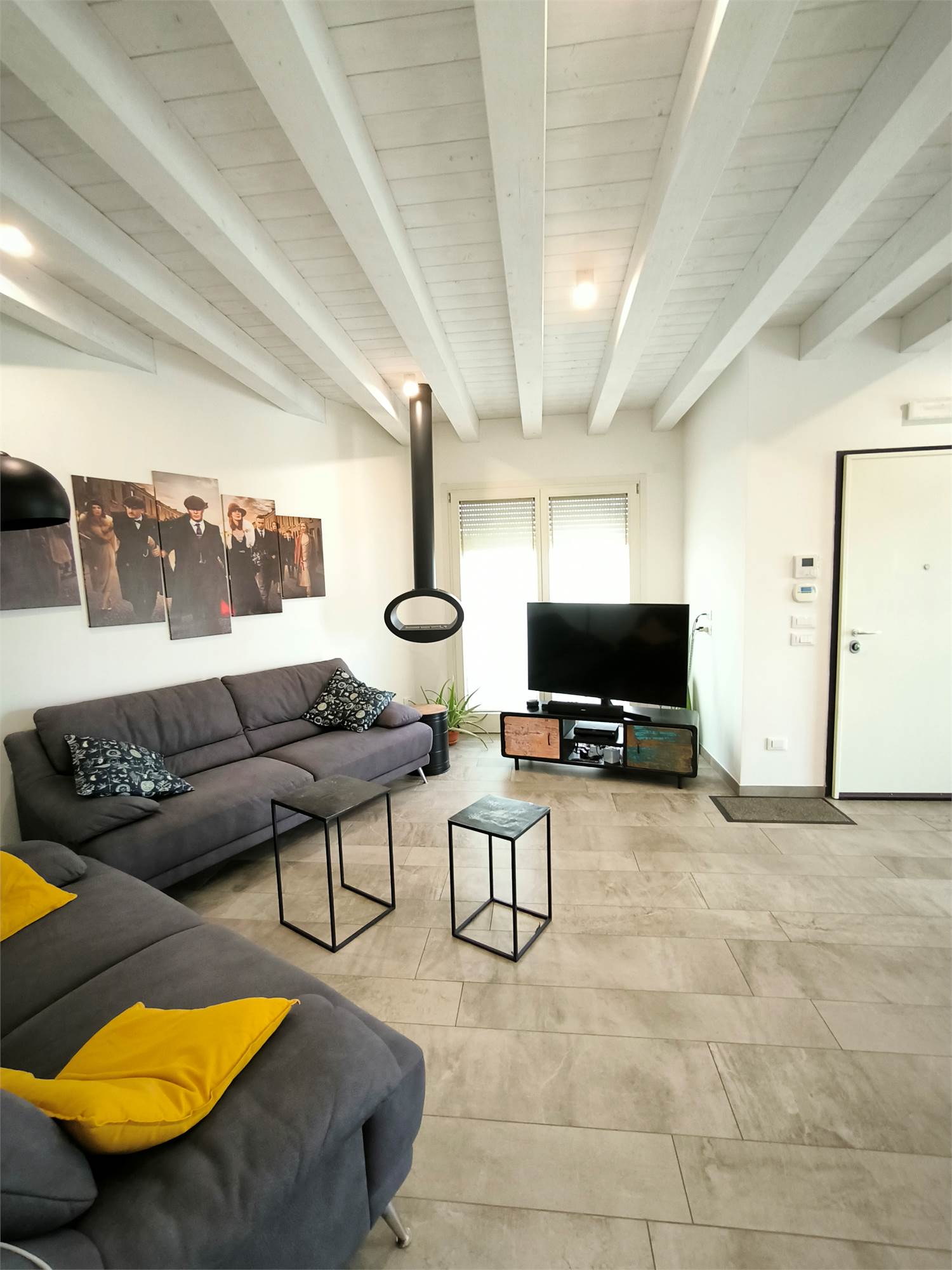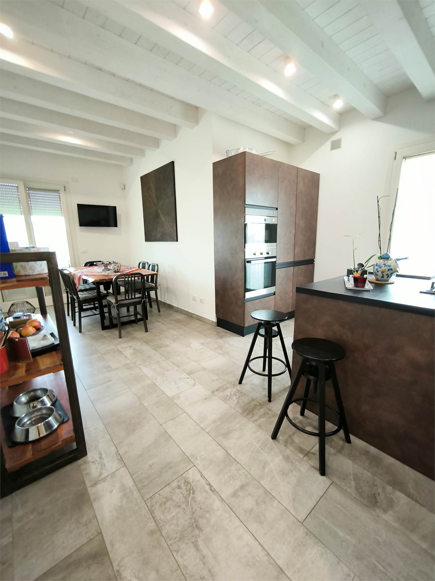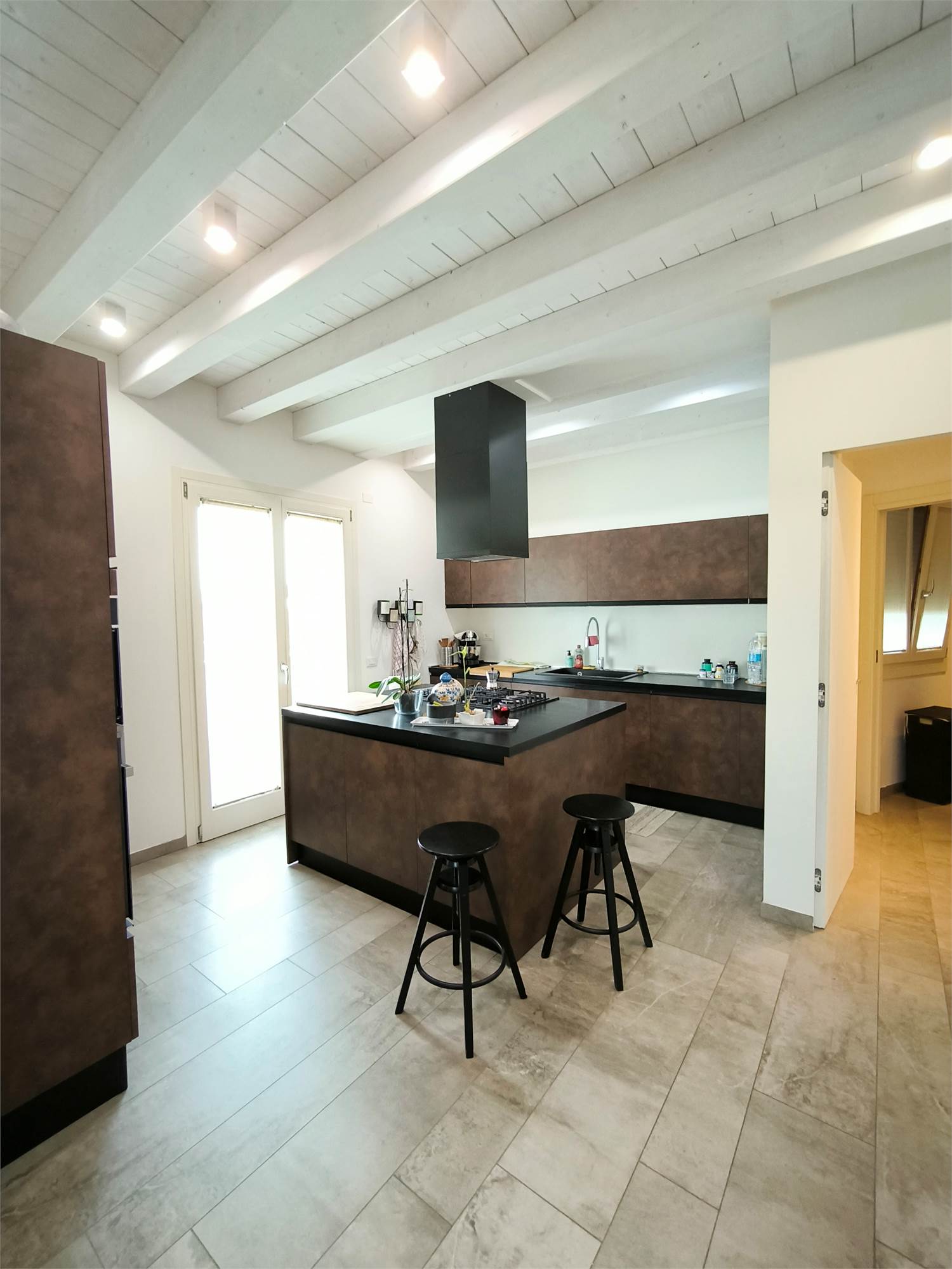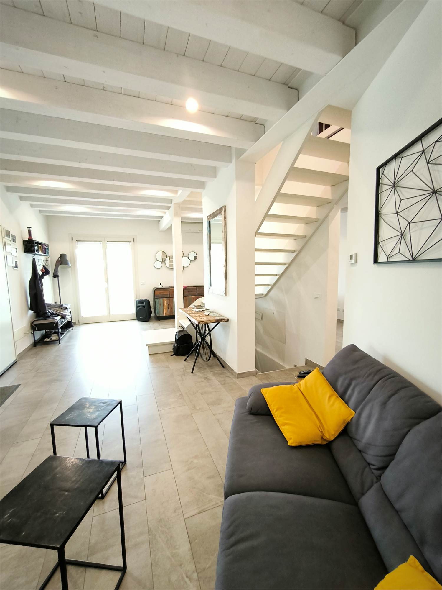 AL PIANO TERRA TROVIAMO UN GRANDE LIVING CON CAMINO, UNA CUCINA A VISTA CON CAPPA CENTRALE SOSPESA, UN BAGNO DI SERVIZIO ED UNA SCALA CENTRALE DI DESIGN CHE PORTA AI PIANI.