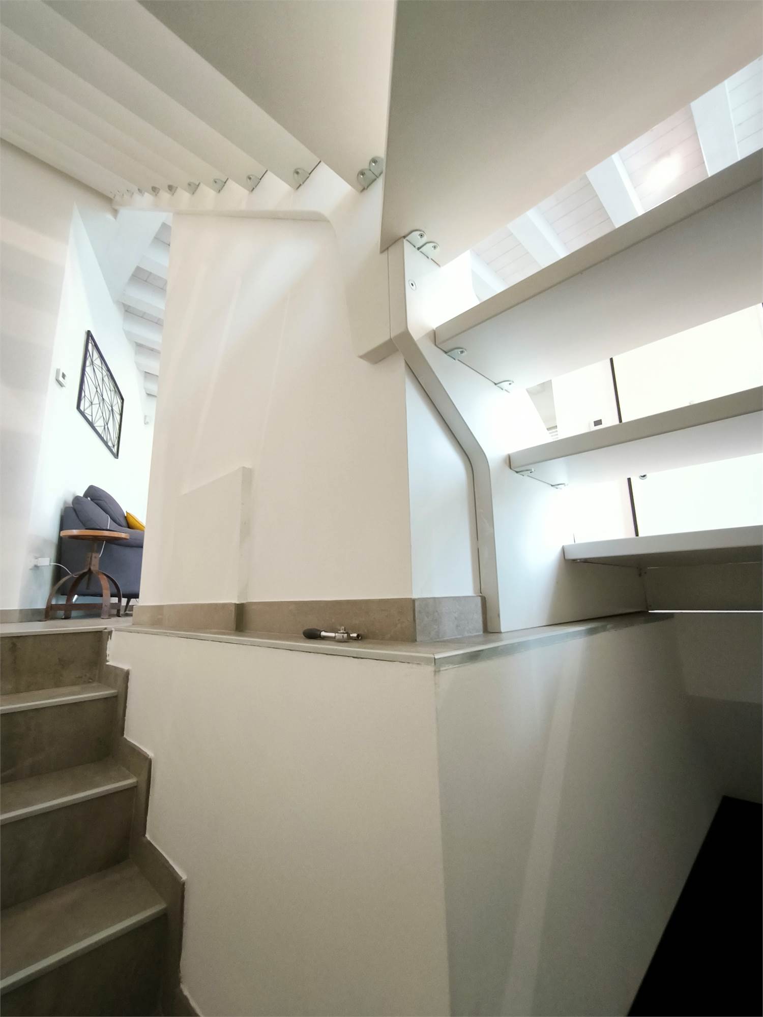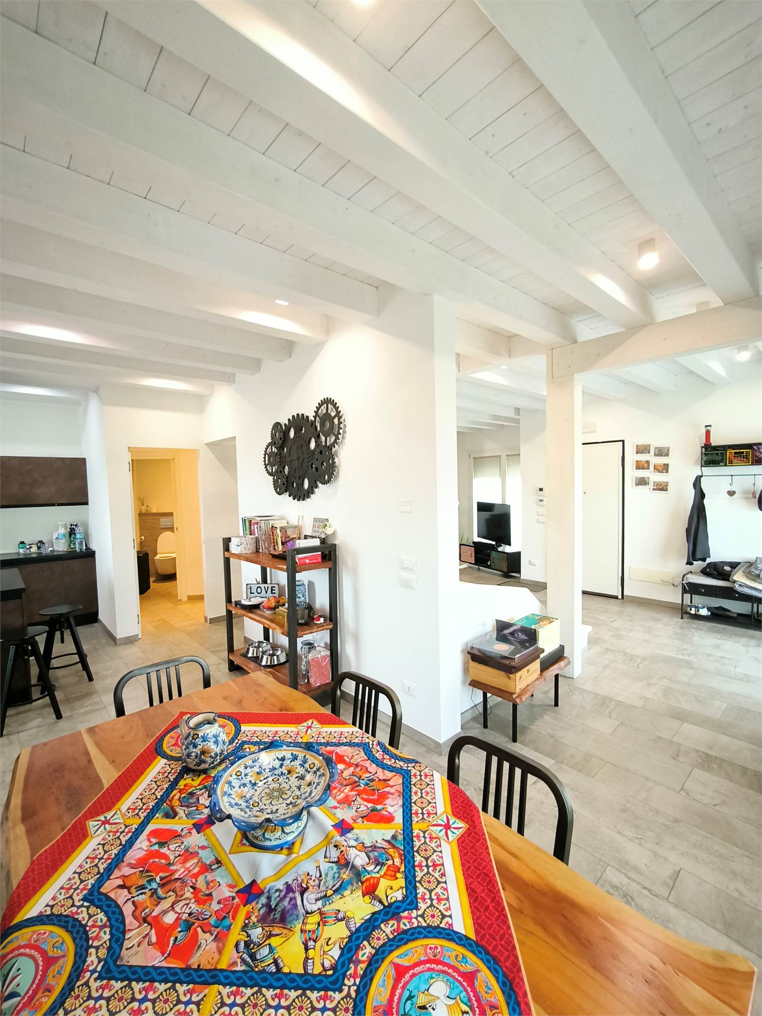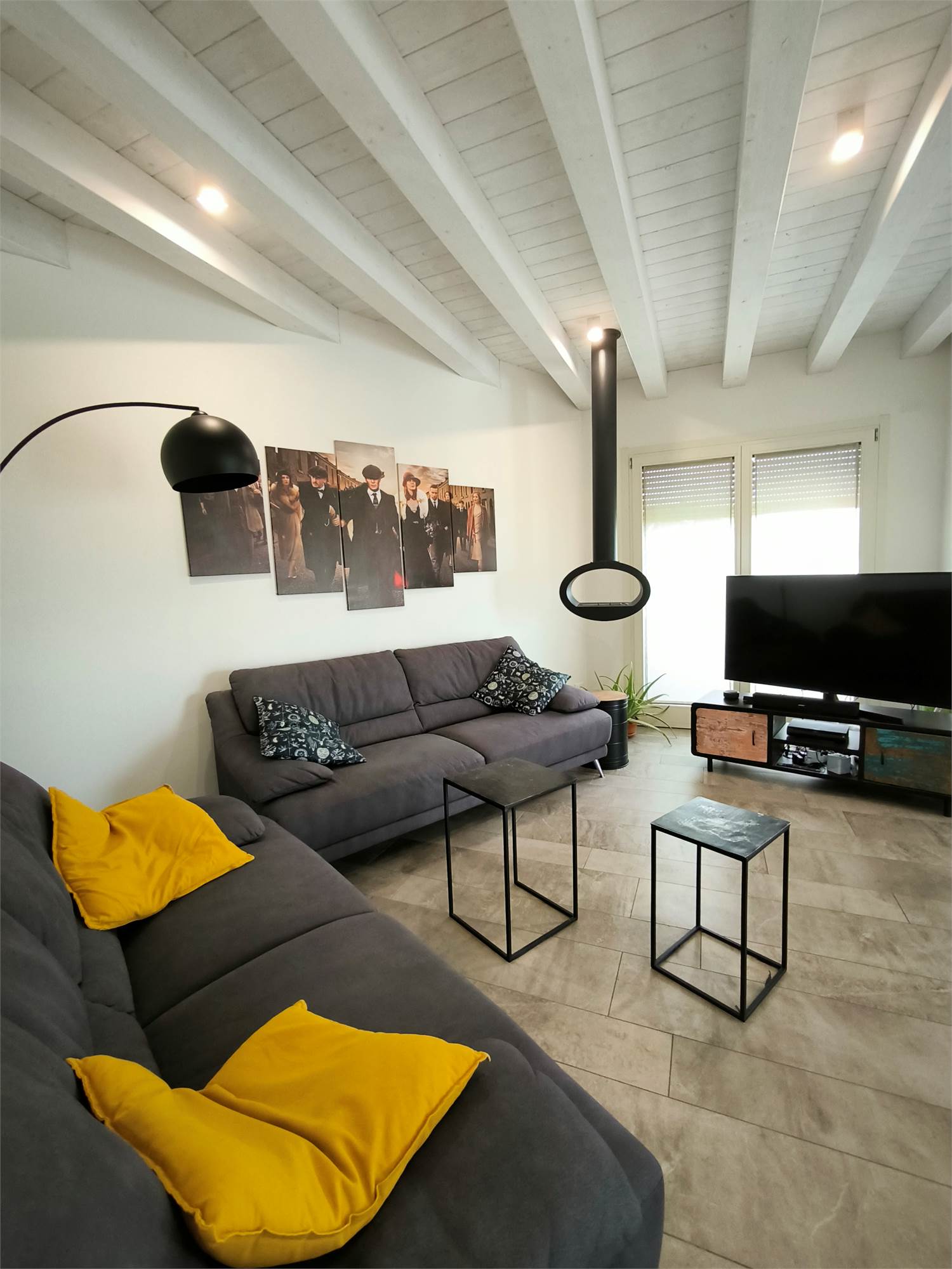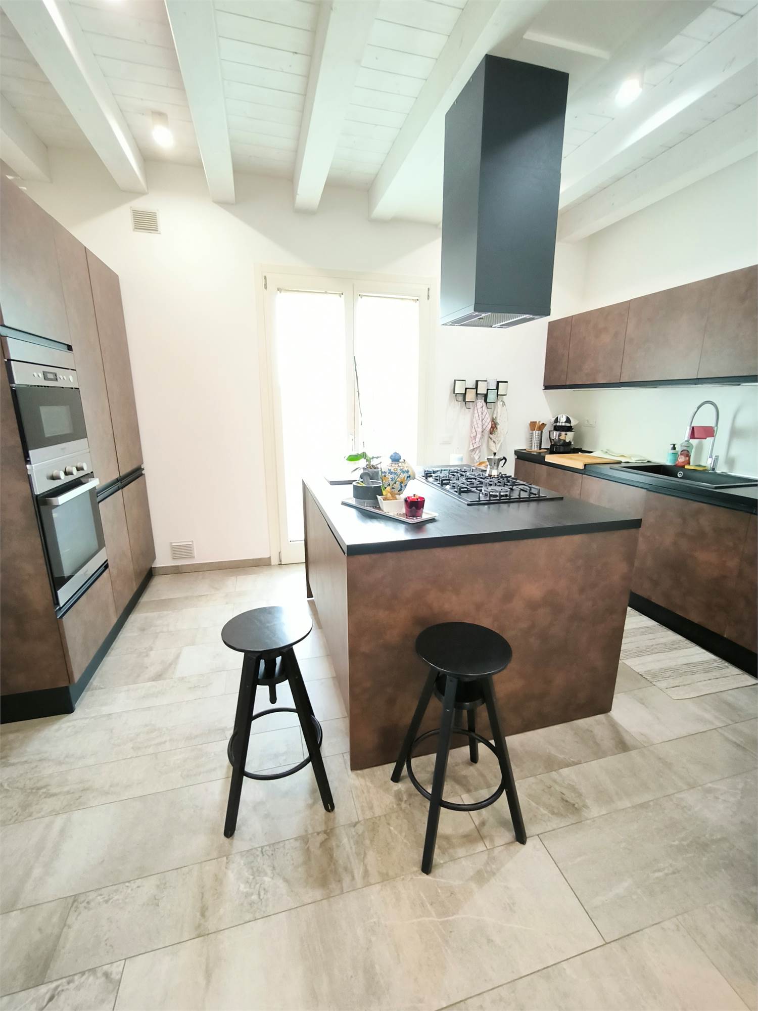 AL PIANO TERRA TROVIAMO UN GRANDE LIVING CON CAMINO, UNA CUCINA A VISTA CON CAPPA CENTRALE SOSPESA, UN BAGNO DI SERVIZIO ED UNA SCALA CENTRALE DI DESIGN CHE PORTA AI PIANI.